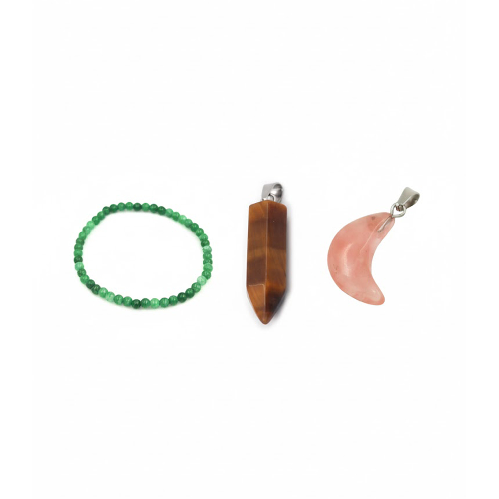 Enciende el fuego ancestral de tu alma con el Pack Luna de Pasión y Riqueza: un dije péndulo de ojo de tigre que revela verdades ocultas con coraje protector, una pulsera de jade verde que atrae flujos infinitos de prosperidad y armonía, y un dije de cuarzo cereza (rosa profundo) en forma de luna creciente que aviva pasiones ardientes y magnetiza amores inolvidables. Perfecto para tu altar personal o como joyas energéticas diarias en Luzmatarot.shop.